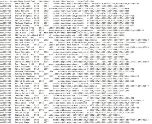 - deathYear – in YYYY format if applicable, else ‘\N’