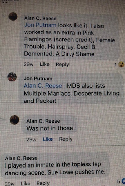 As backup, I'm posting screen-grabs of a conversation that I had recently with Mr. Reese, where he discussed his credits in John Waters movies.  He also clarifies that he plays an "Asylum Inmate" in MONDO TRASHO.