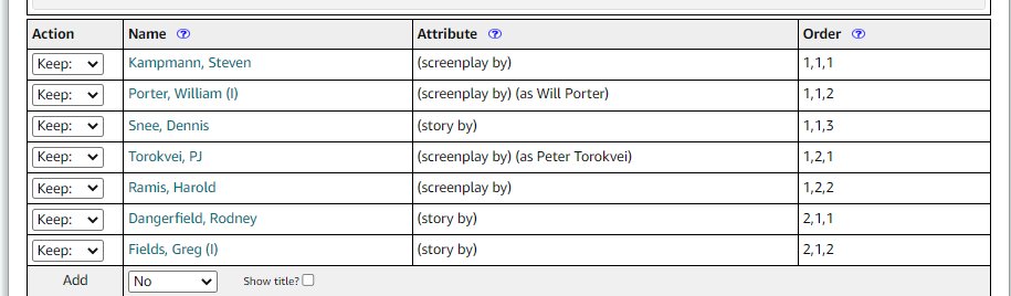 I see that Dennis Snee is currently listed as "1,1,3" when he should be "2,1,3". That is, he has the second kind of writing credit (screenplay first, but he is for story), there is only one team of story writers, and he is the third person listed on that team.