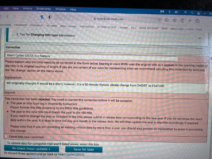 I need to change my film from a SHORT to a FEATURE. I have followed the instructions repeatedly to make this change, and it is rejected. Any advice?