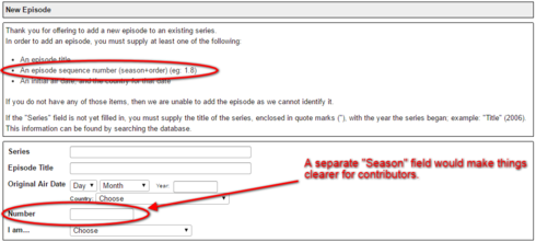 A lot of the confusion would be alleviated by having two separate input fields: one for the season and another for the episode number, instead of the present combined field that's just called "Number".
