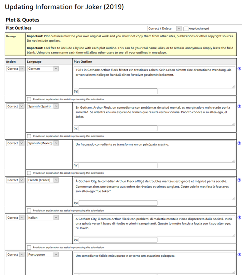 Below, are the currently live plots on the movie Joker (2019), accessed via a quick-link -> https://contribute.imdb.com/updates?update=tt7286456:outlines.correct.all