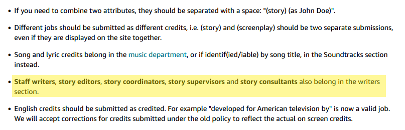 To expound a little on what ljdoncel said, story editors were (somewhat) recently approved for the writing department. A lot of older shows still have story editors in additional crew. I move them out when I see them there.