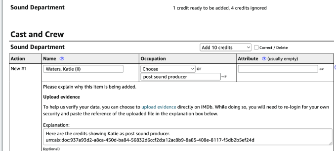 I am trying to add several crew credits to my project but they are getting ignored. I have added an explanation and evidence to each and it still ignores when I try to re-check the updates. What am I doing wrong?