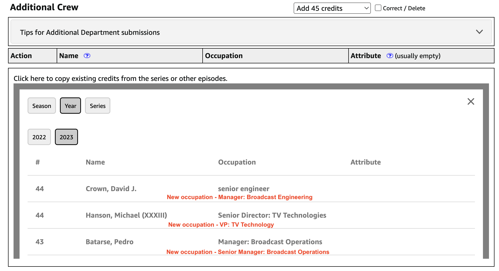 I'm adding episodes to several series. The dropdown is helpful as I can pick the crew, as it will automatically fill that position, but some job titles have changed. I have to type in the new job title each time manually. How can IMDB update this in the dropdown?