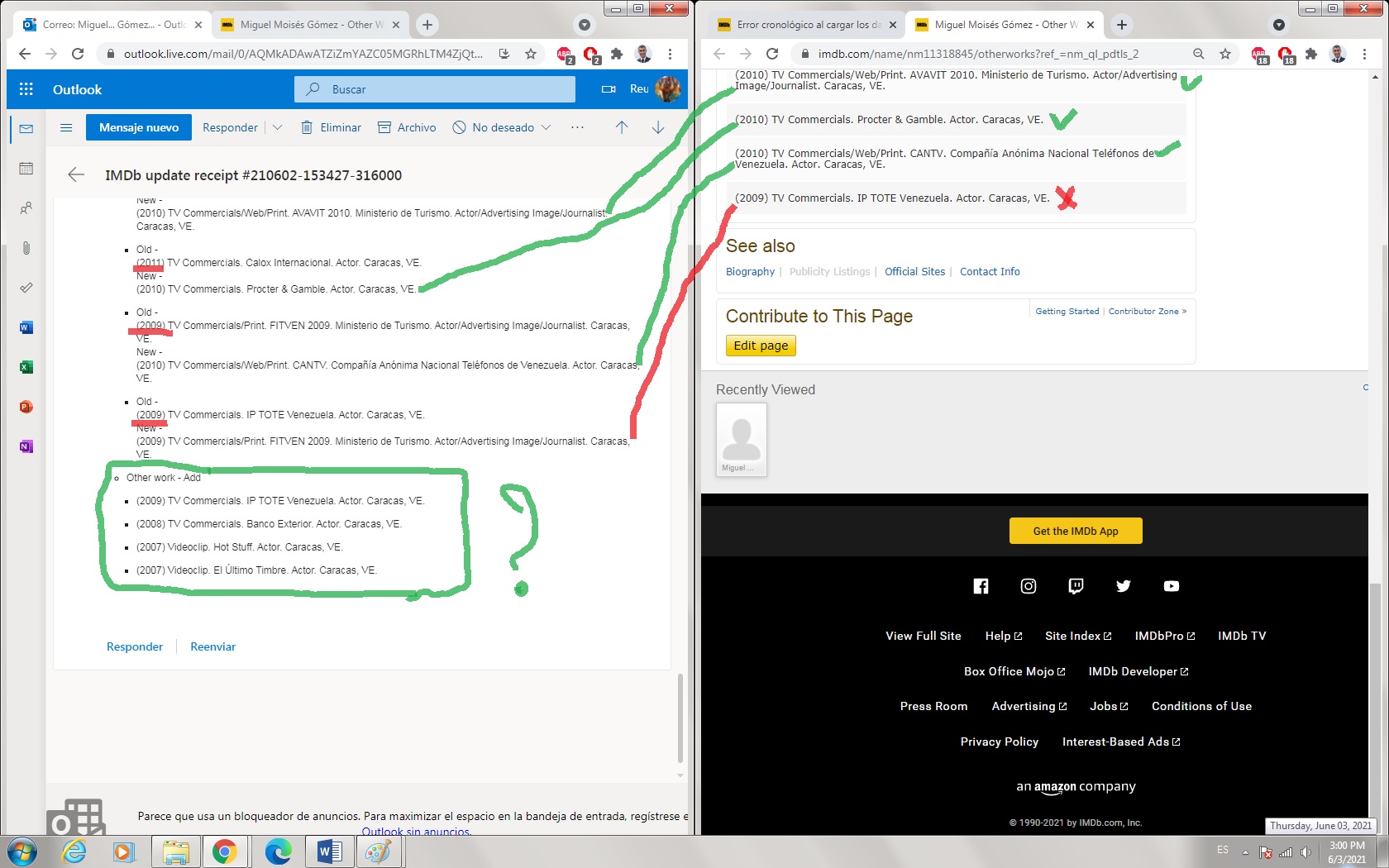 - Desde que publiqué mi lista de otros trabajos en mi perfil. Noté que había sido agregada a la página en un orden distinto al que le coloqué. Al intentar corregirla, me aprobaron varios cambios o correcciones; pero, otros no. Entonces decidí empezar de nuevo la lista. Hasta este momento no he podido publicar mi lista de otros trabajos de manera cronológica -como lo hago en el momento de cargar lo datos-. ¿Qué debo hacer para poder publicar la lista de manera cronológica?