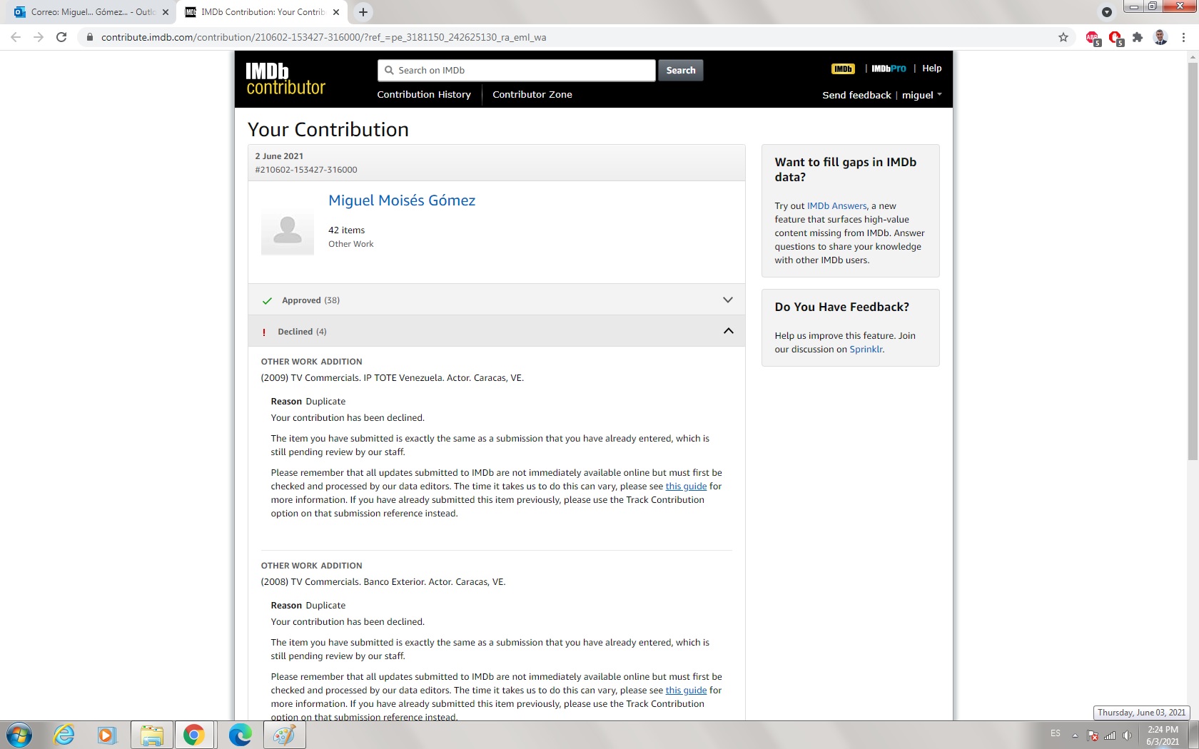 - Unfortunately, the nightmare continues: Of the 11 modifications; only 3 were approved; 7 are pending, most likely to be published in the wrong place; and, 1 is declined because, quote: "Your contribution has been declined. The item you have submitted is exactly the same as a submission that you have already entered, which is still pending review by our staff". This answer is totally wrong because that publication was previously published and their only change was to move it one position down. The same was done with several and even with some of the approved ones.