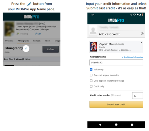 15th March 2019 -- we are pleased to announce the launch of Filmography Cast Credit contributions to IMDbPro members via their name page on the IMDbPro App (available on iOS and Android). With a new redesigned look you can make sure your credits are kept up-to-date, even when you're away from home. This launch is part of our continuing efforts to enhance your experience, provide feature simplifications to improve usability, and identify opportunities to bring consistency across our desktop and mobile platforms.