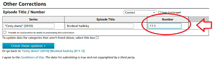To submit the correction you will need to start on the episode title page and click on the "Edit Page button on the bottom. Within the Update form you will need to scroll to the "Other Corrections" section, select 'Correct' and click 'Continue':