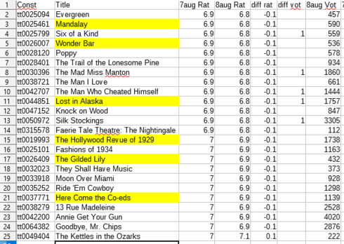 I'm surprised to find that 24 films have changed rating, only 1 of which increased, AND that only 5 had a change in the number of votes:
