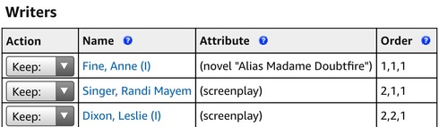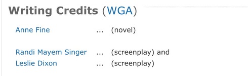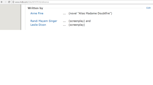 To enable this thread to be found again in a search, I'm going to mention that the title of the source novel Alias Madame Doubtfire (by Anne Fine) is still not displayed in the IMDb writing credits for Mrs. Doubtfire.