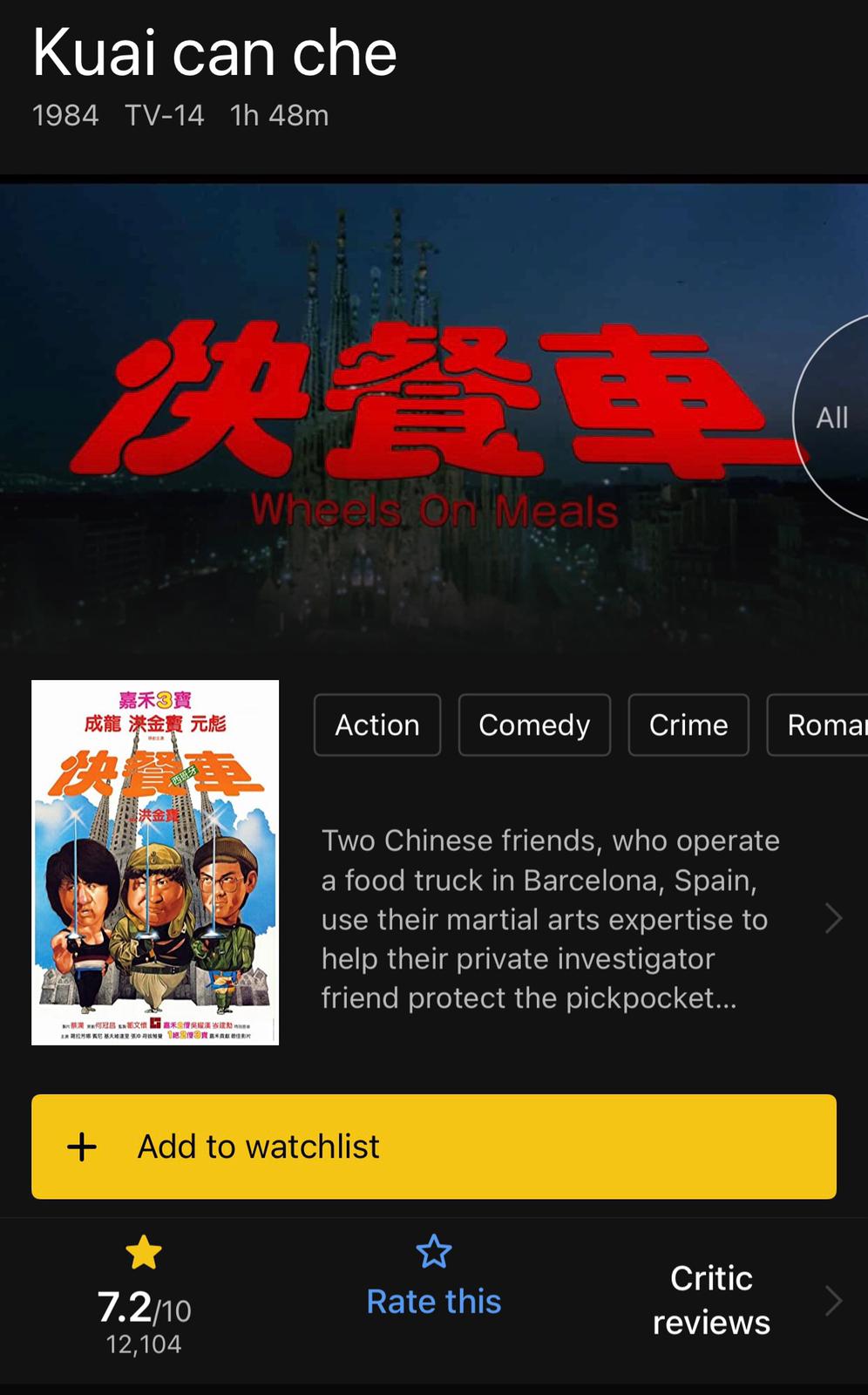 This movie is "Wheels On Meals", a Hong Kong movie in 1984. I don't know what is "Kuai can che". The original title should be "Faai chaan Che" in Cantonese, means fast food truck.