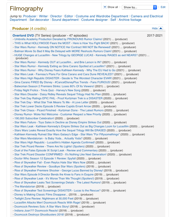 2. Go to town listing credits for the "OverlordDVD" Youtube show without having to identify who is behind the bedpan mask to avoid accountability for the phony entertainment news regularly posted, most of which is outright defamatory by adding the credits using the sock puppet name to grift YouTube monetization.