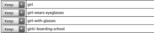 The keyword "girl-with-glasses" is on the keyword display page but is not listed on the update page. The display page says there are 286 keywords but there are only 285 in the list on the update page.