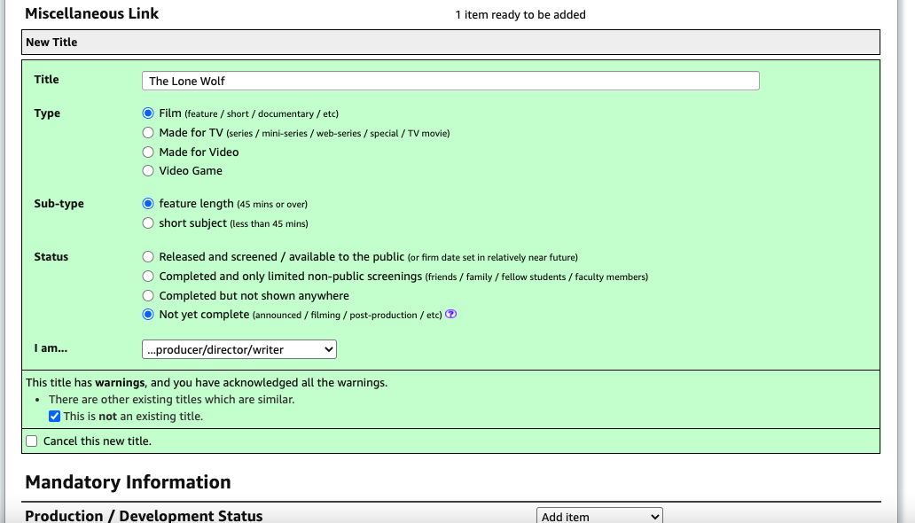 - In the "Miscellaneous Link" section of the new title submission form, add links to third party sites detailing the production.