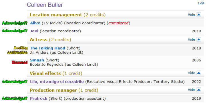 ETA: After watching the trailer for The Talking Head, I think the keyword non-fiction is incorrect, because clearly the characters are scripted. I have submitted the contribution #221031-145403-732000 to remove the keyword. This way, the credit that is currently in your "Self" section will be moved to the "Actress" section.