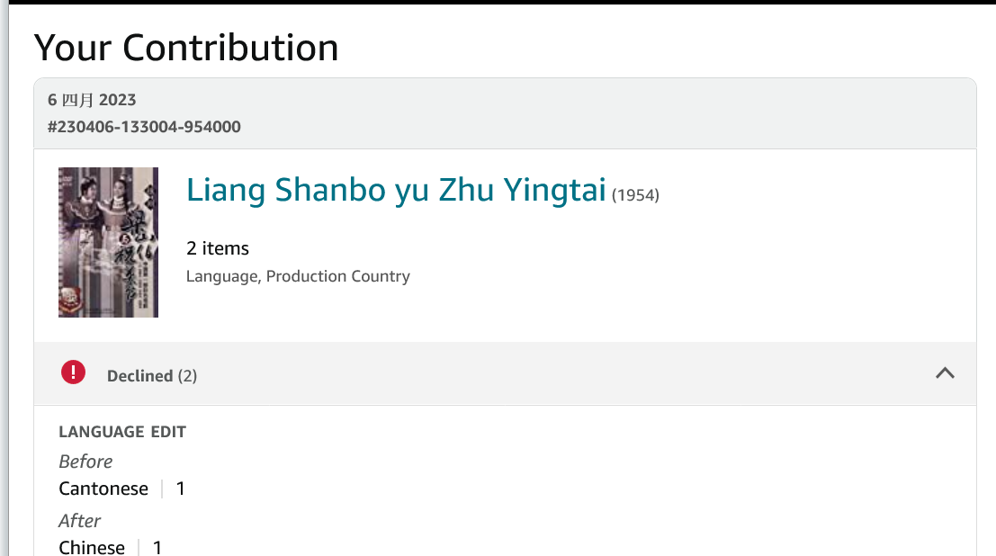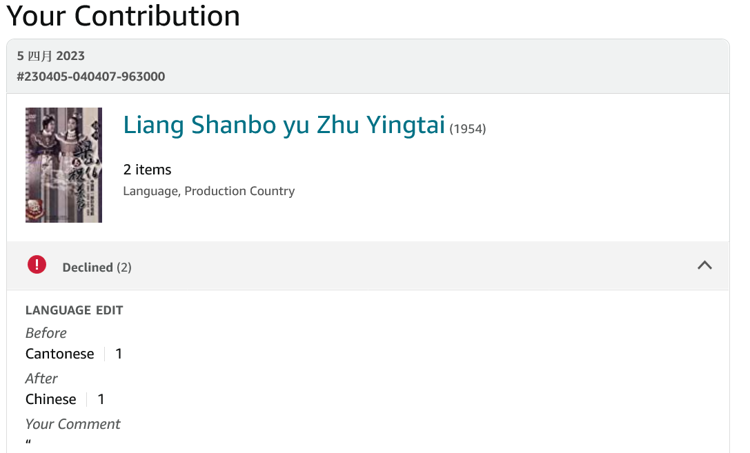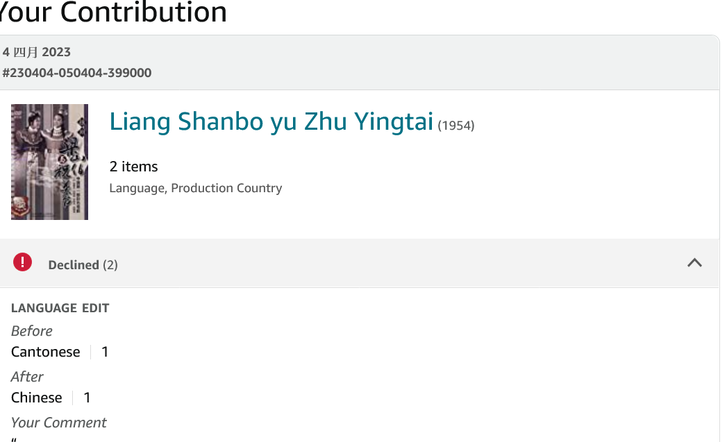 Second, it is not "Cantonese" movie, but you can say it spokes "Chinese". It is a Yue opera 越劇 (Shaoxing opera 紹興劇) spoken "Wu" Chinese language 吳語 (A Chinese dialect, just like Cantonese, Min nan or Hakka) but there is no "Wu" option in your database, but you can fix it to "Chinese" ("Chinese language" can include all dialects). Some information you can find in HK Film Archive's "From Real to Abstract - Cine Attempts on Stage Operas" to screen superb opera films (the movie title written as "The Butterfly Lovers"): https://www.info.gov.hk/gia/general/201411/13/P201411130694.htm