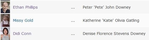 Ethan Phillips played Pete Downey. Missy Gold played Katie Gatling. Didi Conn played Denise Stevens, until she married Pete and became Denise Downey. I'm going to be charitable and assume that the existing character names were submitted before the current policy on keeping names simple went into effect, but at any rate, the current formatting of these character names is not in compliance with policy. In fact, of the seven actors appearing most often on "Benson", only Robert Guillaume's character, who was known as and is listed in IMDb as Benson DuBois, is identified in accordance with policy. The next six actors are each listed with at least four words in their character names, at least one of which and often two of which should not have been included.