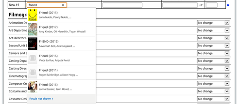 We are pleased to announce today (13th December 2017) we have added Title Suggestion Search to IMDb’s Filmography contribution form and Company Suggestion Search to IMDb’s Title contribution form. As you begin entering a Title or Company credit, we will now provide suggestions based on what you’ve typed and the context of the submission (for example, as you type “Friend” as a Title, the list will auto complete to provide more information beyond just popularity).
