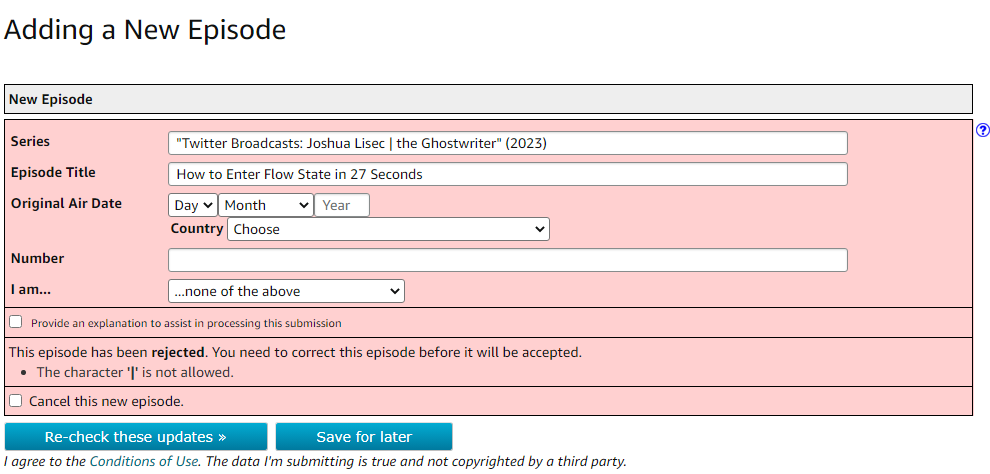 Hello! I am unable to add the latest episodes of a show because it rejects the use of '|' characters. When I remove them it can no longer recognise the episode and asks if I want to link it to the actual episode containing a '|'. When I link it, I get the same error that it's an unsupported character. What are my options?