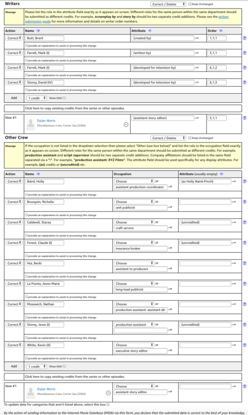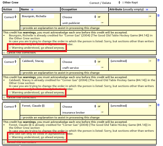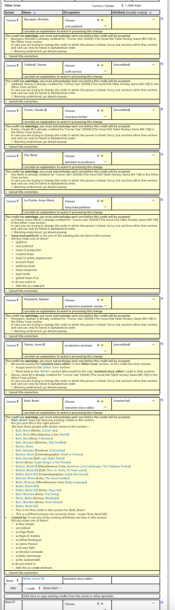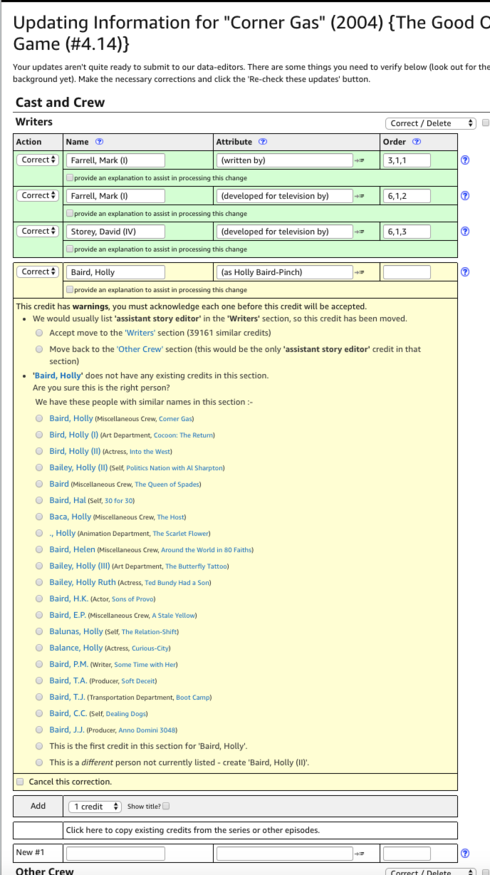 I have been having problems editing Other Crew sections of tv episodes. When I try to delete for example Story Editor credits there and I press "Re-Check These Updates", sometimes the edits switch so that these deletions or other edits are in the wrong places (which means I would be deleting the wrong people). Other times, when I try to add new people in Other Crew, these additions disappear when I press "Re-Check These Updates". Also, sometimes people are doubled in Other Crew (when I am editing them) or some people are missing. Also, now I get this message on everything in Other Crew: "... is already credited for "Corner Gas" (2004) {Mothers Day (#4.12)} in the Other Crew section. In case you are trying to change the order in which the person is listed: Sorry, but sections other than writers and cast can only be listed in alphabetical order."