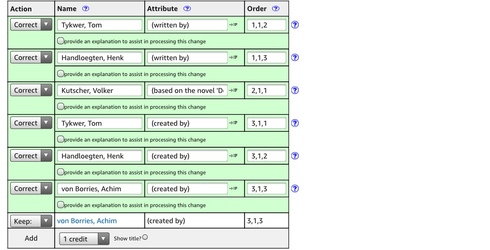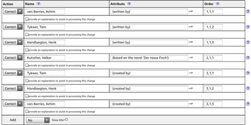 I can confirm some of the weirdness imoth describes. For instance, I tried setting all the writing credits for a different title to Correct, then adding an 'assistant story editor' credit in the same form. On the next screen the new credit is moved to Other crew, but also something happens to the existing writing credits.