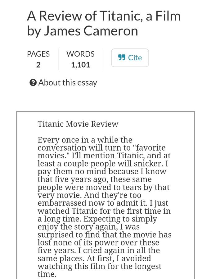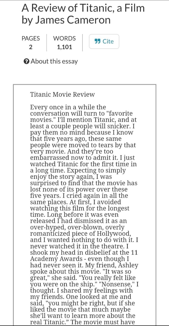 The entire first paragraph of this review is taken from an essay accessible on "Kibin". Therefore, I ask IMDb Customer Service to remove the review completely or to remove only its first paragraph. I cannot provide the link of the essay which was plagiarised (I don't have it anymore and the essay is not free) but I have a picture showing clearly that this review's first paragraph was taken from that Kibin essay. I attached the picture to this mail : the picture shows 3/4 of the first paragraph of Kibin's Titanic essay which is the exact same one as the 'A Superb Epic" review first paragraph.