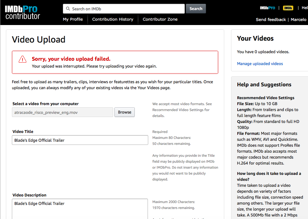 I've been trying to upload a trailer video through ScoreCard but the same message keep showing up: "Sorry, your video upload failed.