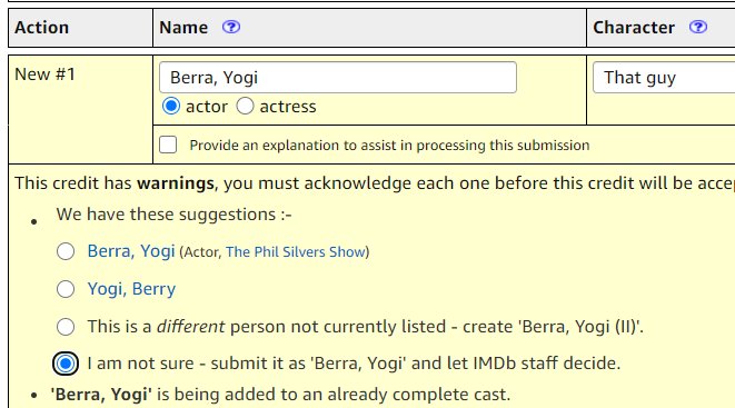 So how do I help the verification process? In the notes, it says to provide an explanation, which I did the first time around, thinking that since it was giving a warning about the cast being complete, it would help to avoid the items being rejected with the explanation that I was looking right at the credits in the movie itself to enter the information.