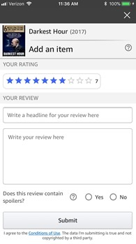 2) On the Submit Review page,you can add a review title, add or edit your star rating, and add a detailed review. Please note whether your review contains any spoilers. Tab Submit when you’re finished!
