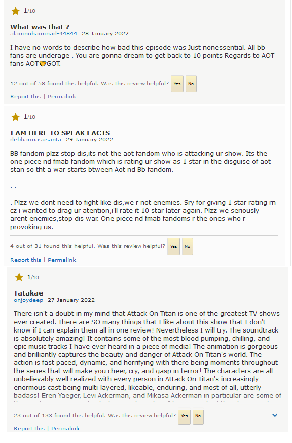 I’ve got another report. The same exact case of attack on titan happened with specific other series. One of them is Breaking bad Ozymandias and star wars top rated episodes, and for everyone her saying AOT fans did the same. BB fans did the same with hero when it got a 10. Its not their first time. One piece rating makes sense since the last episodes were truly bad the ratings are kinda in their place, but regarding all of that its not the point of who started. Its an issue that affected many series out there, but I spoke about AOT specifically.