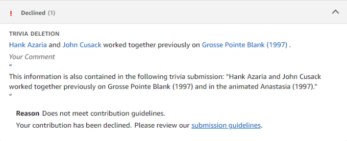 I like to read through the trivia for movies and shows that I watch. I figure that while I'm at it, I can help out a bit by suggesting they delete pieces of trivia that are duplicates of others. Usually, that's pretty easy to do. Recently, however, a lot of my suggestions are rejected with the reasoning "unable to verify". I've tried resubmitting my suggestions, directly citing the other trivia submission that contains the same information, and sometimes that works, but sometimes it's still rejected. What more do they want from me?