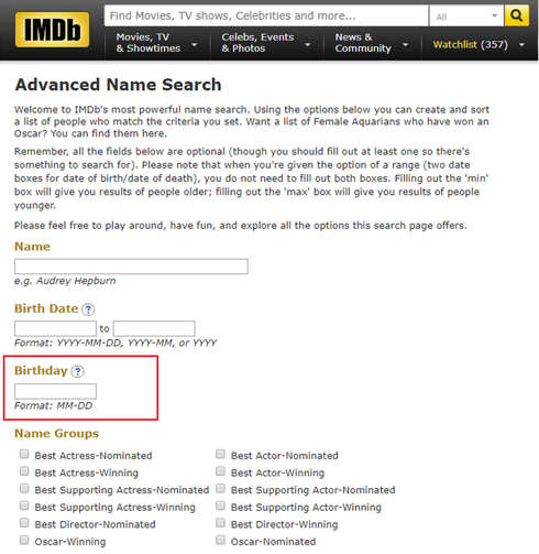 Birthdays today -> http://www.imdb.com/search/name?birth_monthday=01-12
