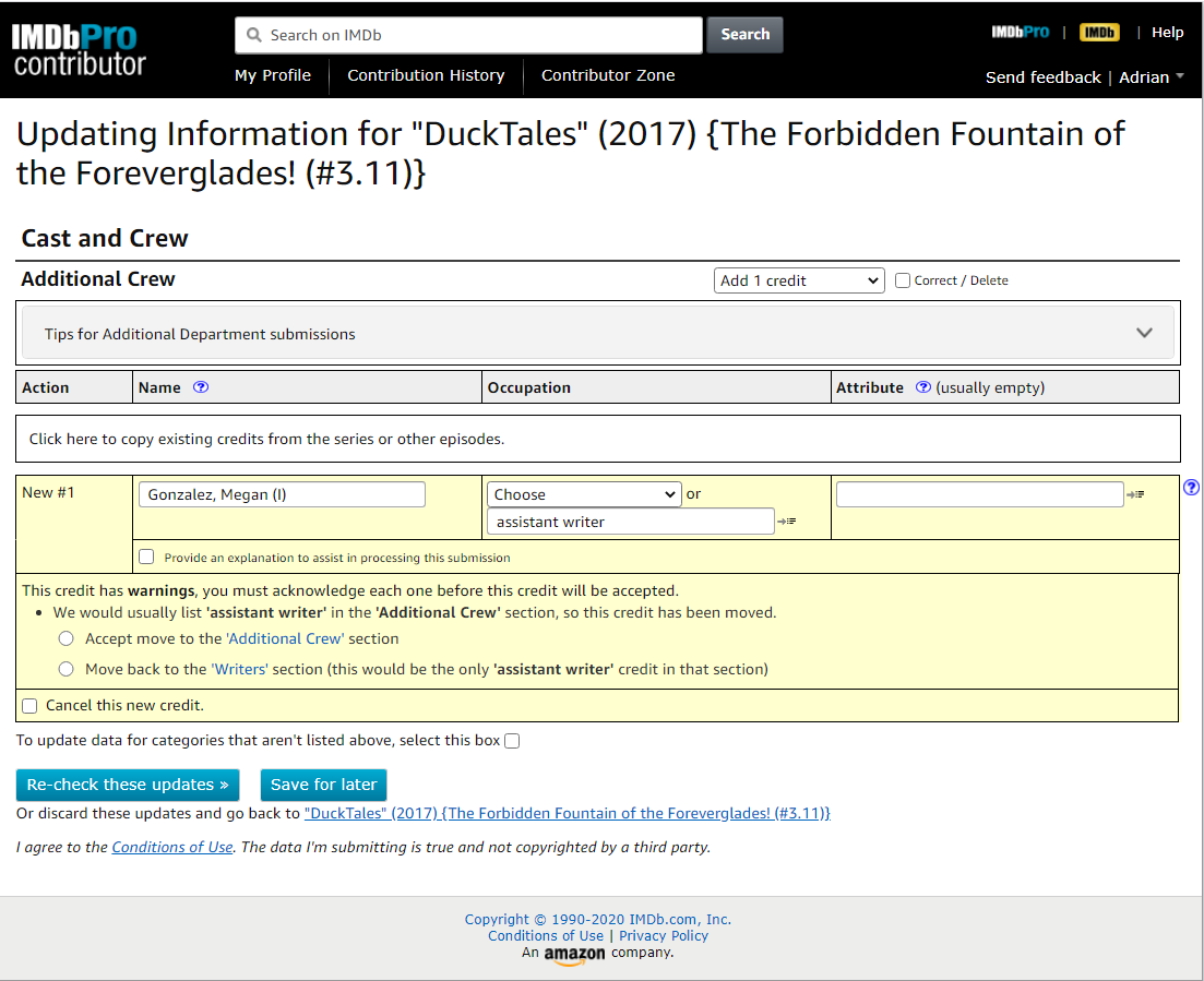 DuckTales has a credit for "assistant writer" which I believe is different from "writers' assistant" and belongs in the Writing section and not the Additional Crew section. But, an odd thing happens if you try and add it while also editing the Additional Crew Section. The credit disappears! I believe the credit is there, but not visible, in the Additional Crew section. If I had another valid credit, it would get submitted to the additional crew because she is in that section for other episodes that I added her to the writing section.
