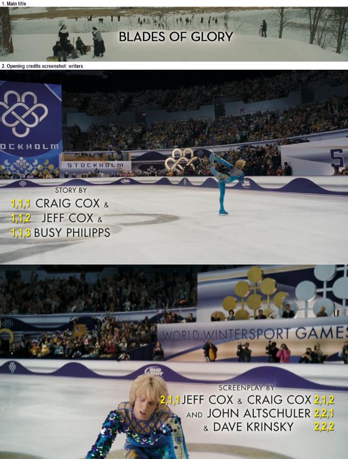 According to the on-screen titles, the correct attributes and order numbers for the writing credits on Blades of Glory (2007) should be the following: