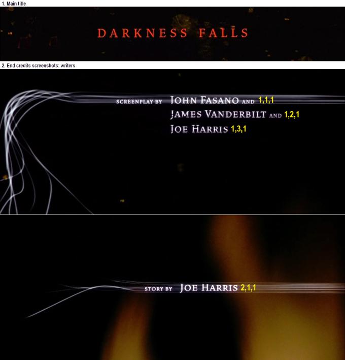 According to the on-screen titles, the correct attributes and order numbers for the writing credits on Darkness Falls (2003) should be the following: