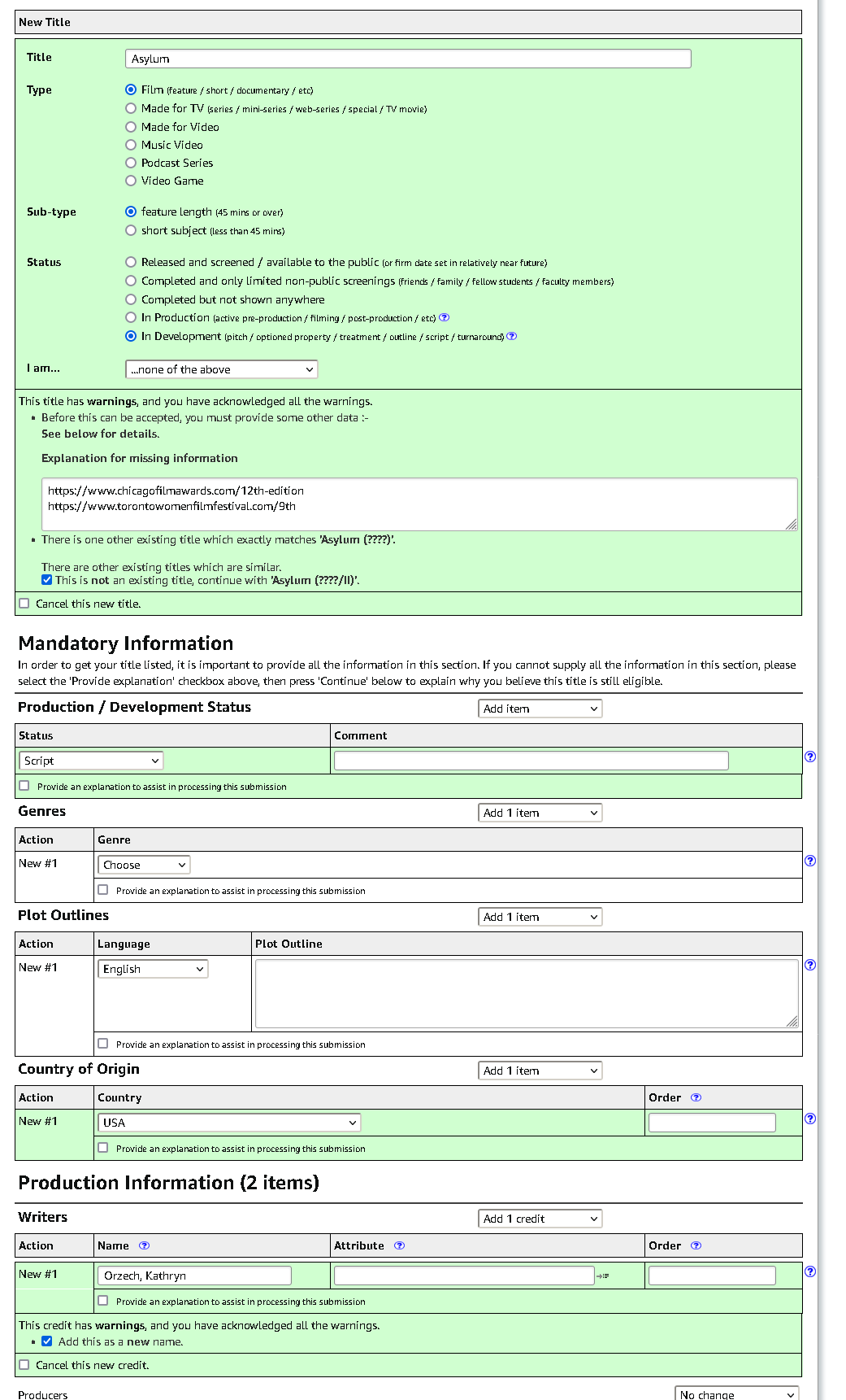 IMDb events are:  2021 Toronto International Women Film Festival (category is live so I'll add to it) and 2022 Chicago Indie Film Awards (category must be added). As a data source, Asylum and I are listed among winners on Chicago's and Toronto's festival websites. I have a poster to upload, too.