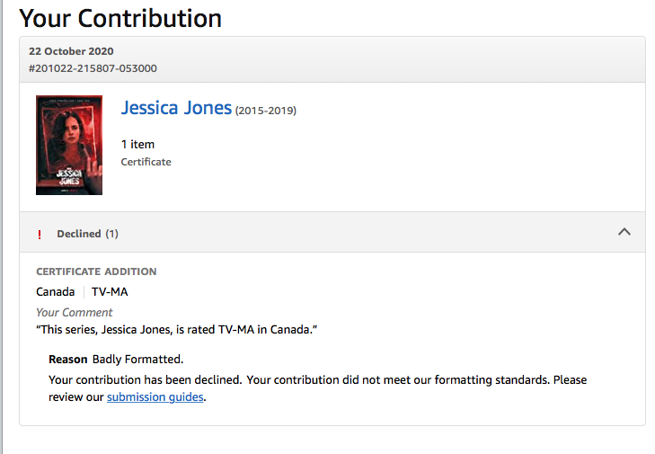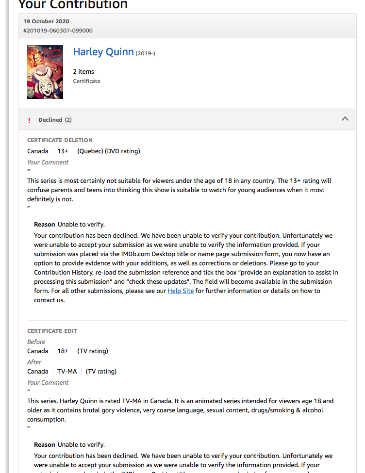 I agree, I've tried to change the rating for Jessica Jones https://www.imdb.com/title/tt2357547/?ref_=nv_sr_srsg_0 as for some reason it says "13+" for Canada, which is obviously not the actual rating. It is TV-MA. Same thing for Harley Quinn https://www.imdb.com/title/tt7658402/?ref_=nv_sr_srsg_3 which is also TV-MA. But when I submitted these changes, they weren't accepted. I have no idea why and they should be accepted as they are the ACTUAL ratings of these titles and parents should not think that these titles are appropriate for the kids! They'll especially be misled by Harley Quinn, since it's an animated series!
