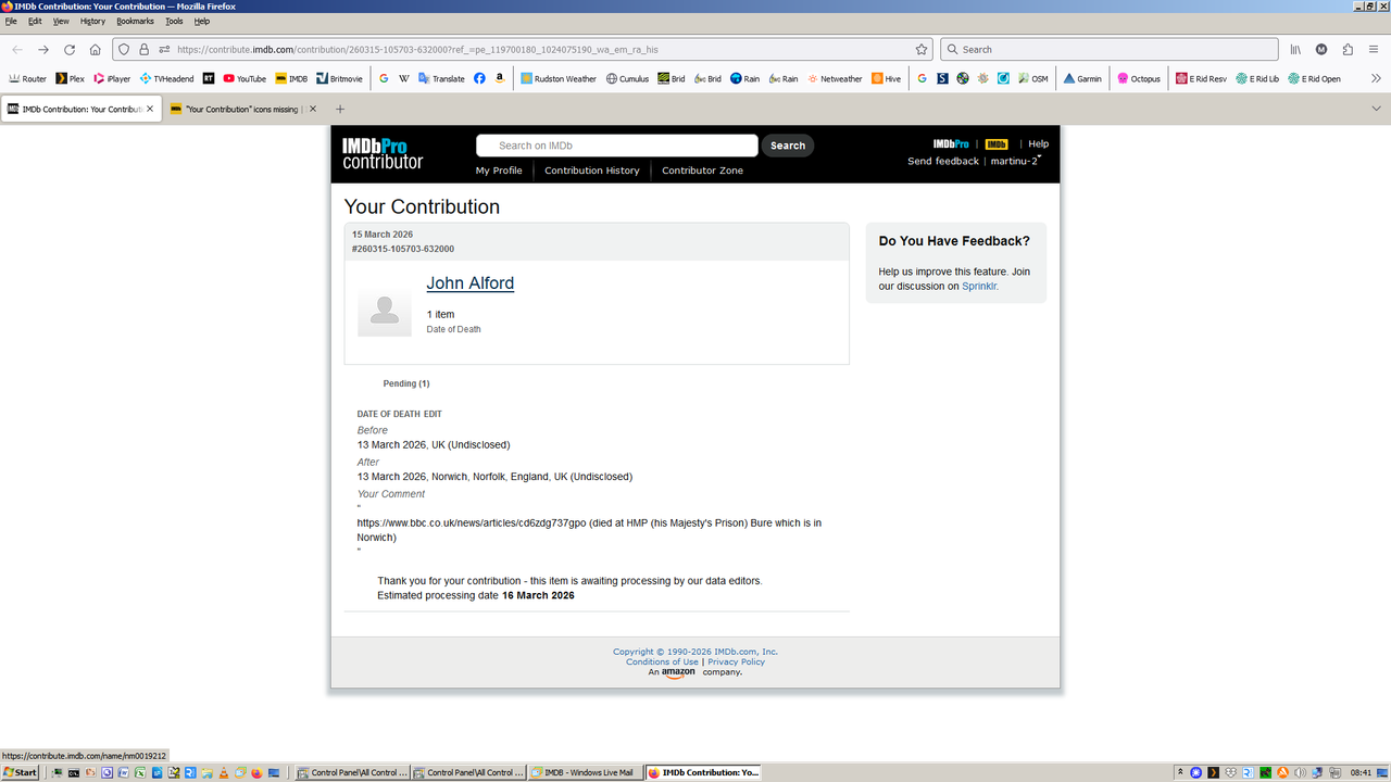 When a contribution has been submitted and you receive the confirmation email, you can click on View Contribution Status. The resulting page marks Accepted entries with a green tick and Pending ones with a blue letter i. But recently in Firefox, the tick or i icons are not being displayed. Google Chrome is still displaying them. I've cleared the Firefox cache and it doesn't help. Is anyone else seeing this, or is it just me? If it's me, I'll look more closely at my setup.