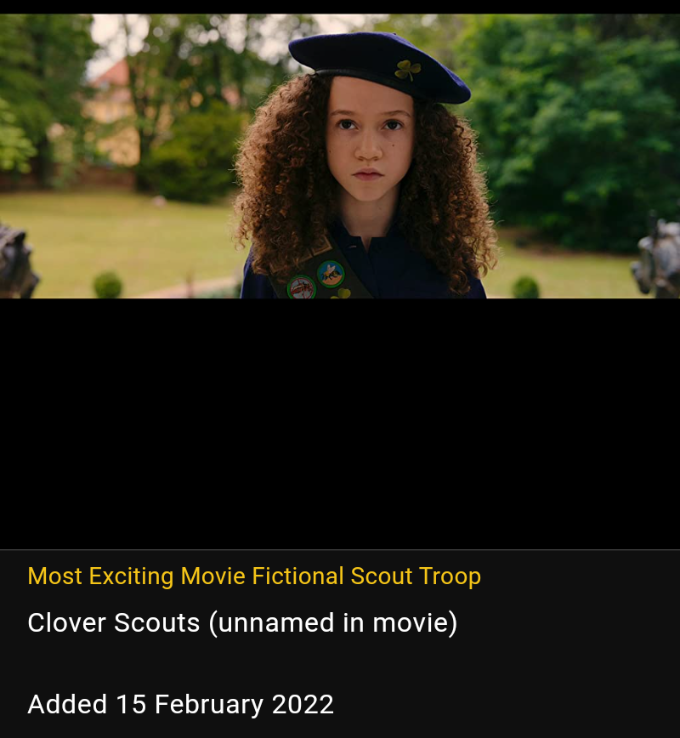 IIn 2020, three important scouting anniversaries are celebrated.The 'Baden-Powell Scouting Society' will mark the 120th anniversary ofthe first scouting troop. The boys of this troop started the worldwidescouting movement in 1900. Boy Scouts of America's incorporation onFebruary 8th, 1910 marks the group's 110th year with 110 millionAmerican participants since its inception. Likewise, the Girl Guidescelebrates its 110th year that began with the first female-only scouttroop in Pinkneys Green, England in 1910. Worldwide, scouts are thelargest youth movement in the world with 40 million current members from223 countries. In celebration of scouting and its impact on shapingglobal youth, a set of tribute polls featuring fictional scoutingorganizations in movies, television series and other media. Thegenre's most recent entrant is the Amazon original movie, Troop Zero (2020).
