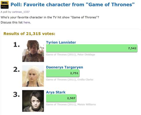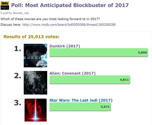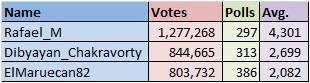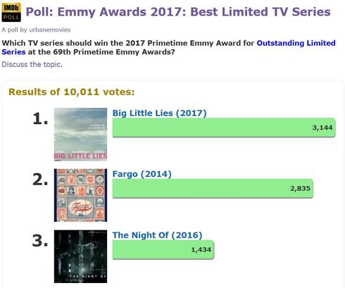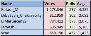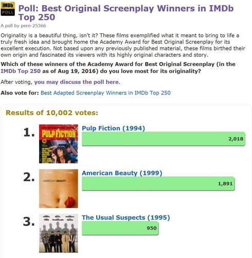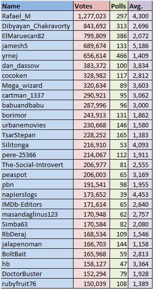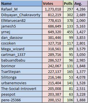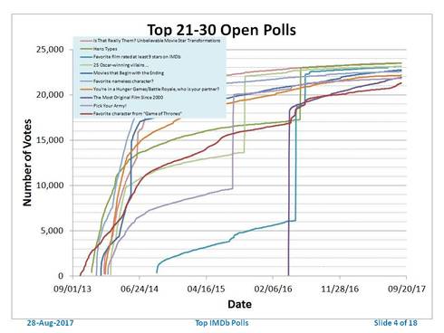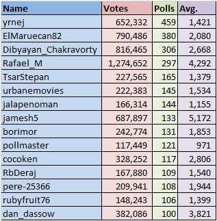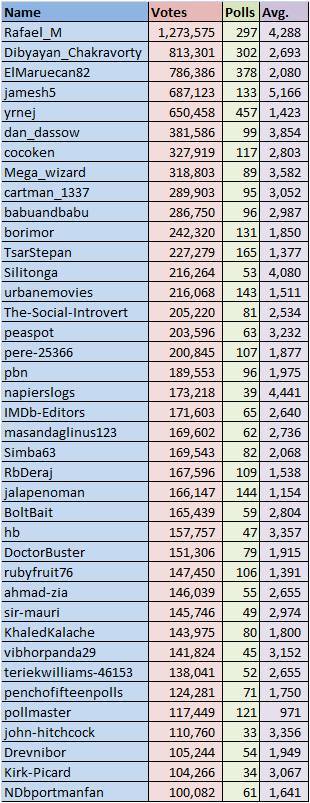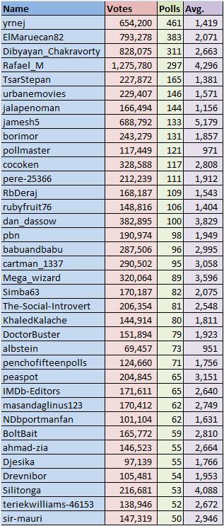 FAQ:Key Threads - IMDb Poll FAQs Index ========================================================= Some of the older live polls no longer have threadsassociated with them. As of today, I will post information on polls that have achieved milestones such as 10,000 votes in this thread and the original threadwhen it is still active. You can see information on the current top 210 polls at: Top IMDb Polls http://mypollwatch.blogspot.com/2015/07/top-imdb-polls.html Milestone include: * Attaining the Poll Maker badge. * Reaching 150K, 200K, 250K votes, etc. * Having 50, 100, 150 polls, etc. * Any other poll related achievement. Note polls appearing on home page are reported in a different thread. FAQ: Polls Featured at IMDb Home Page Mon Aug 31 201506:04:11 Which of these sunglasses-sporting movie characters looksthe coolest? emadel79's poll (http://www.imdb.com/poll/b3zBT1SMKjE/) is the 34th poll to achieve 15,000 votes. It currently has 15,024 votes. Tue Sep 1 201506:06:52 Top 25 sequels better than the original ... ElMaruecan82's poll (http://www.imdb.com/poll/bZtI0jH5cqg/) Fri Sep 4 201514:37:20 Congratulations ElMaruecan82 on your 188th live poll! As of 4-Sep-2015 12:06 AM Pacific your polls have 500,082or more votes, for an average of 2,660 votes per poll. You are the secondperson to have their polls receive 500,000 or more votes. Sat Sep 12 201508:37:09 Congratulations ahmad-zia for achieving 100k votes andfor your shiny new poll maker badge. By my estimates, you earned the badgesometime on Monday September 7, 2015. Sat Sep 12 201509:16:20 Congratulations jamesh5 for achieving 500,000 votes. As of 10-Sep-2015 your polls have 502,755 or more votes,for an average of 2,660 votes per poll. You are the third person to have theirpolls receive 500,000 or more votes. Tue Sep 15 2015 08:11:06 The best kickass female characters of Fantasy/Sci-Fi rose-taylor's poll (http://www.imdb.com/poll/q-PwPY2Ku-E/)is the 4th poll to reach the 30,000 vote mark. It currently has 30,000 votes. Sat Sep 19 2015 22:13:20 Favourite Law Enforcement/ Intelligence Officer in TV(2000-2013) vibhorpanda29's poll (http://www.imdb.com/poll/o9BXsjQR2r0/) is the 99th poll to reach the 10,000 vote mark. It currently has 10,003 votes. Mon Sep 21 2015 01:38:57 Coolest Movie Poster of 2014? yrnej's poll (http://www.imdb.com/poll/x210wcWPByE/) is the 100th poll to reach 10,000 votes. It currently has 10,003 votes. Sep 25 2015 21:01:07 Upcoming Sequels to '70s, '80s and '90s films sheetsadam1's poll (http://www.imdb.com/poll/IQFPjH6EROc/) is the 101st poll to reach 10,000 votes. It currently has 10,003 votes. Thu Oct 1 2015 15:19:43 Movies that Begin with the Ending absiddique1's poll (http://www.imdb.com/poll/ObiToaJcY6I/) is the 16th poll to reach the 20,000 vote mark. It currently has 20,005 votes. Face-Off : Jennifer Lawrence Vs. Rebecca Romijn babuandbabu's poll(http://www.imdb.com/poll/GjAbOARQ1aE/) is the 102nd poll to reach the 10,000vote mark. It currently has 10,048 votes with a rank of 99. Fri Oct 2 2015 02:47:48 25 Oscar-winning villains ... ElMaruecan82's poll (http://www.imdb.com/poll/x6YuVj19ECo/)is the 36th poll to reach the 15,000 vote mark. As of Oct 2, 2015 2:47 AMPacific, it had 15,043 votes. It is the 17th poll to reach 20,000 votes. As of Oct 4,2015 1:00 PM Pacific, it had 21,347 votes and a rank of 15. Sun Oct 4 2015 12:55:36 Best New TV Show nuca2107's poll (http://www.imdb.com/poll/9VN_Hl1wKL8/)is the 103rd poll to reach 10,000 votes. It currently has 10,011 votes. Fri Oct 16 2015 17:54:21 Face-Off: Gravity vs Interstellar vs The Martian Congratulations Dibyayan_Chakravorty on your 100th livepoll! As of 16-Oct-2015 1:47 AM Pacific your polls have 169,599 or more votes, for an average of 1,696 votes per poll. Thu Oct 22 2015 06:14:39 Congratulations ElMaruecan82 on your 200th live poll! As of 21-Oct-2015 11:10 PM Pacific your polls have 531,071 or more votes, for an average of 2,655 votes per poll. Sat Oct 24 2015 14:08:15 Classic Clothing - Movie Heroes! jamesh5's poll (http://www.imdb.com/poll/uAu16EYf-Hg/) is the 104th poll to reach 10,000 votes. It currently has 10,002 votes. Wed Oct 28 2015 13:27:41 Iconic Objects of Sci-Fi and Fantasy jamesh5's poll (http://www.imdb.com/poll/ckJ9vlxxw40/) is the 105th poll to reach 10,000 votes. It currently has 10,010 votes. Fri Oct 30 2015 22:46:23 Swedish Vampire Bros: Roman vs. Northman Congratulations Rafael_M on your 250th live poll! As of 30-Oct-2015 1:39 PM Pacific your polls have 943,511or more votes, for an average of 3,774 votes per poll. Sun Nov 8 2015 01:07:58 If an American actor HAD to play James Bond, it wouldhave to be... Rafael_M's poll (http://www.imdb.com/poll/qT4InuSgd1c/) is the 106th poll to reach 10,000 votes. It currently has 14,017 votes and hasa rank of 44. As of 11-Nov-2015 7:49 AM Pacific it is the 37th poll to reach 15,000 votes. It currently has 17,197 votes and has a rank of 25. Wed Nov 11 2015 08:09:40 Pitt, Cruise, DiCaprio and Depp, what should they havewon the Oscar for? jamesh5's poll (http://www.imdb.com/poll/29BKJjU-2do/) is the 38th poll to reach 15,000 votes. It currently has 15,017 votes. As of 10-Nov-2015 6:18 AM Pacific your 129 polls have531,191 or more votes, for an average of 4,118 votes per poll. Thu Nov 19 2015 18:39:02 Congratulations Dibyayan_Chakravorty, Your polls have more than 200,000 votes. As of 18-Nov-2015 12:16 AM Pacific your polls have 200,886or more votes, for an average of 1,810 votes per poll. Thu Nov 19 2015 18:46:39 Iconic Beards cocoken's poll (http://www.imdb.com/poll/E25UfcvEjCQ/) is the 39th poll to reach 15,000 votes. It currently has 15,003 votes. Thu Nov 26 2015 05:31:42 imige's poll (http://www.imdb.com/poll/T0vTaBkGbfA/) is the 108th poll to reach 10,000 votes. It currently has 10,004 votes. Sun Dec 6 2015 04:59:31 Silitonga's poll (http://www.imdb.com/poll/8Y2IOS0Hvfk/)is the 109th poll to reach 10,000 votes. It currently has 10,003 votes. Sun Dec 6 2015 05:53:55 pollmaster's polls reached 100,00