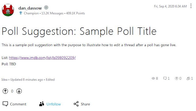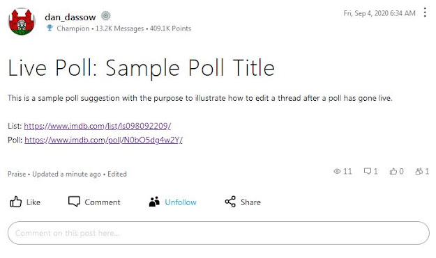 Unlike Get Satisfaction, users on Sprinklr can still edit their own posts after someone has responded to a post. IMDb Champions and Poll admins with admin rights can only edit their own posts.