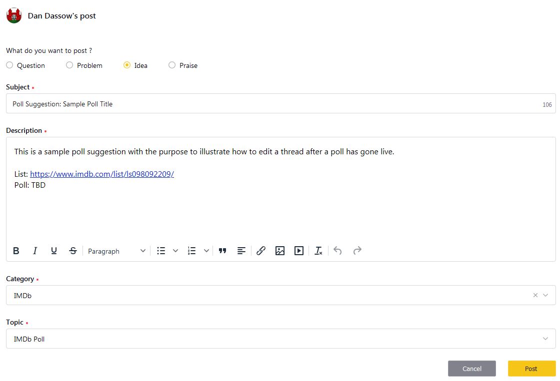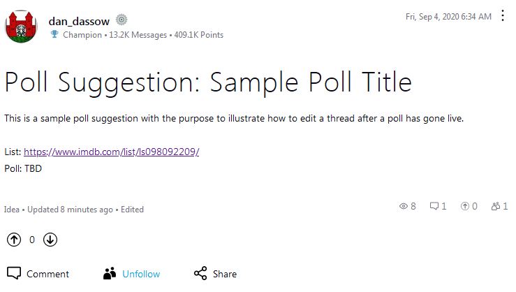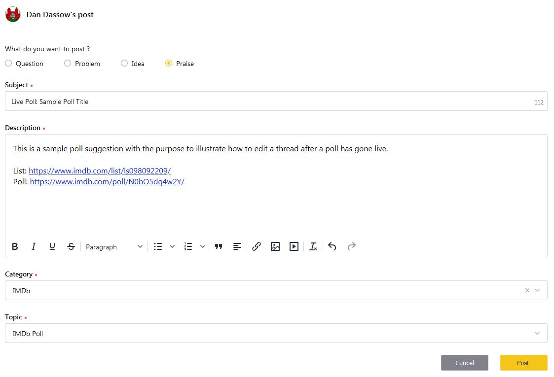 Once a poll has gone live, the original author of a thread needs to edit the first post in a thread to change the thread type from Idea to Praise. This helps admins and other users tell live polls apart from suggestions. It will also be helpful to change the title to indicate the poll is live.