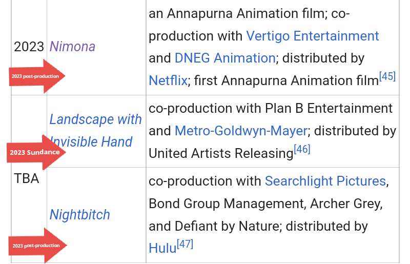 I wouldn't list Nimona yet, it looks like it is near complete, but they haven't even announced a release date yet. There are also two other titles that are due out by the end if the 2023 year or in early 2024. One of them already had a showing at Sundance two months ago.