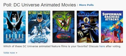 02 August 2017: DC Universe Animated Movies - http://www.imdb.com/poll/t0FiUaOB1v8/ (A poll by NDbportmanfan)