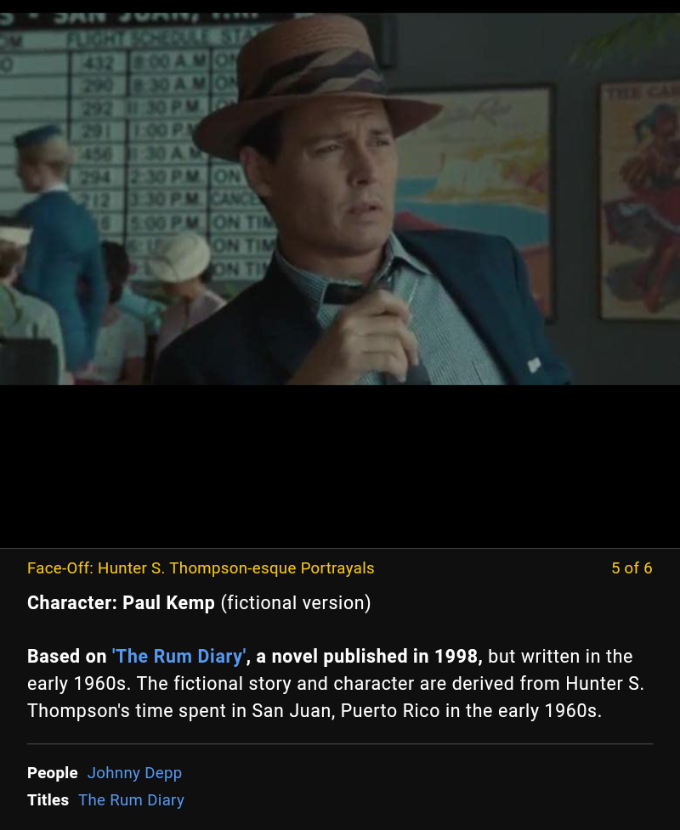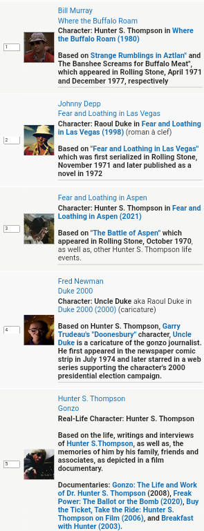 See the list of Hunter S. Thompson-esque movie portrayals here: https://www.imdb.com/list/ls066150062/