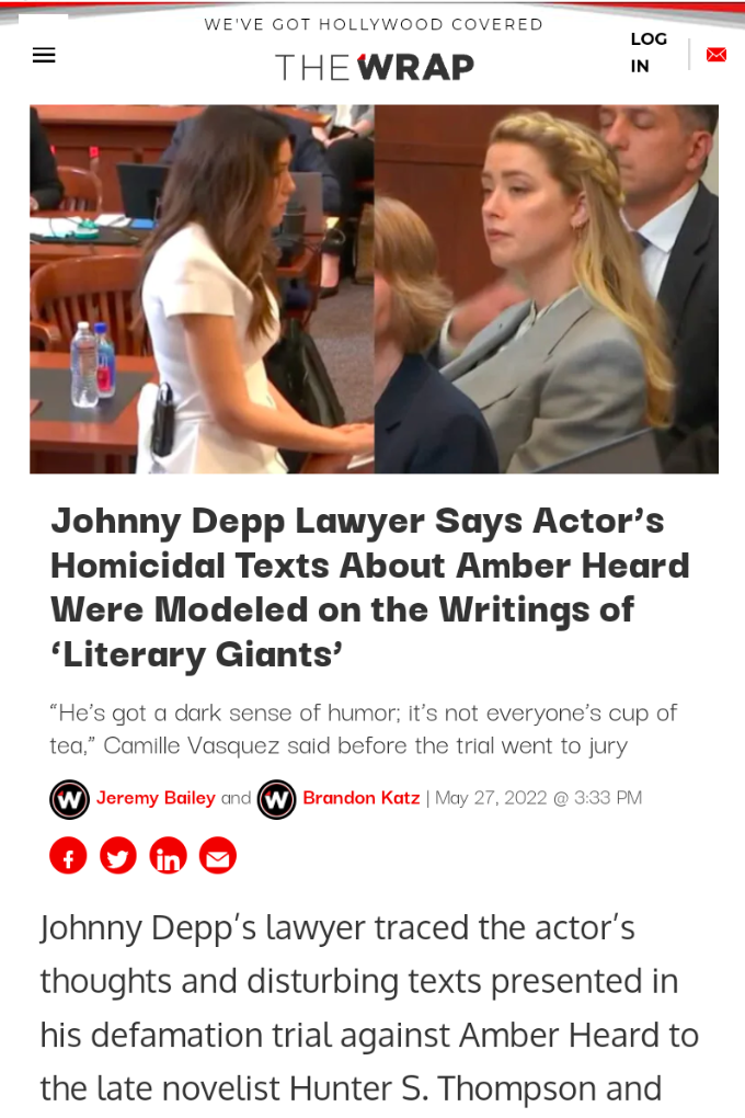 Interestingly, Camille Vasquez rolled out the Hunter S. Thompson defense @ the Johnny Depp - Amber Heard defamation trial. https://www.thewrap.com/johnny-depp-lawyer-says-actors-homicidal-texts-about-amber-heard-were-modeled-on-the-writings-of-literary-giants/