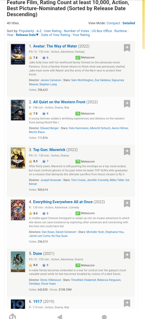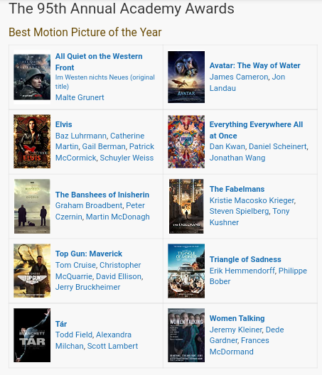 Top Gun: Maverick (2022), All Quiet on the Western Front (2022), Everything Everywhere All at Once (2022) and Avatar: The Way of Water (2022)