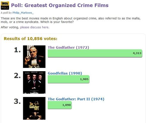 Philip_Marlowe_'s poll Greatest Organized Crime Films is the 294th poll to reach 10,000 votes. It currently has 10,856 votes with a rank of 256.