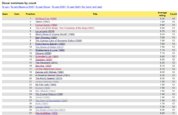 There are a lot of titles missing from your list, even from the current top 250, and a lot of errors in the number of nominations.